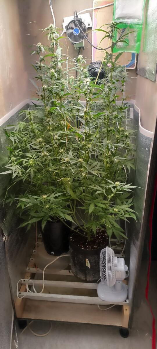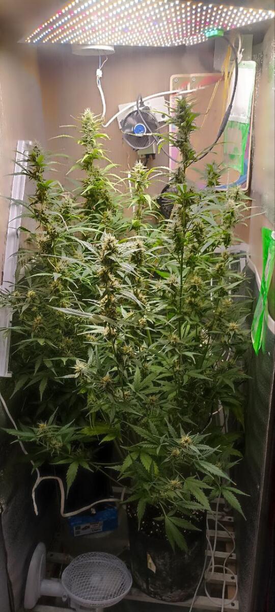 Это мой самый первый гров да ещё и в индоре. Он мне бонусом прилетел и как цветет каннабис видел первый раз. По мере роста покупал всё необходимое. Он бедолага перенес два стресса ( я его почти сломал и одна пересадка в покупной грунт) Короче он натерпелся. Освещение 3 дешёвых led лампы и 2 прожектора по 100 и 70 Вт с цветовой температурой 6000К и 2700К соответственно. Общая мощность 310Вт. Короче маловато. Из удобрений только BioBizz grove и bloom по половине дозы от указанных в инструкции при каждом поливе.Вода только покупная. И даже у меня получился симпатичный кустик. Только он у меня уже 12 недель и всё никак не созреет. Т.к. это мой первый гров то на фото уже трёх кол не хватает. Извините за нетерпячку