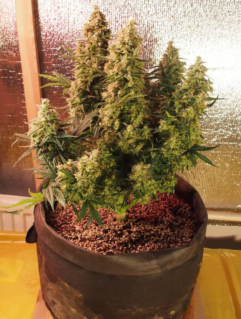 Этот сорт отличный кандидат на стелс-гровинг: очень короткие сроки веги/цветения, маленькая высота – 43 см, компактный куст, нет сильного запаха , высокая плотность соцветий, стресс устойчивый. Харвест вышел 76 дней.