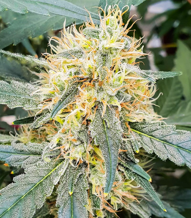 В среднем одному растению требуется около 10-11 недель, чтобы пройти путь от прорастания семечки до харвеста. Кусты вырастают компактными, но разветвленными. Плотная крона со смолистыми соцветиями покрывается белоснежными трихомами с вкраплениями ярко-оранжевых пестиков.