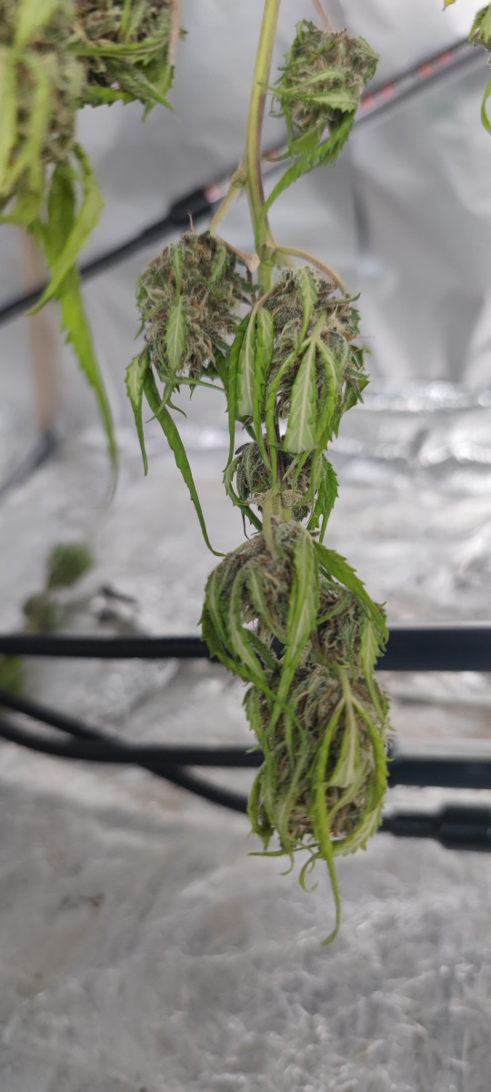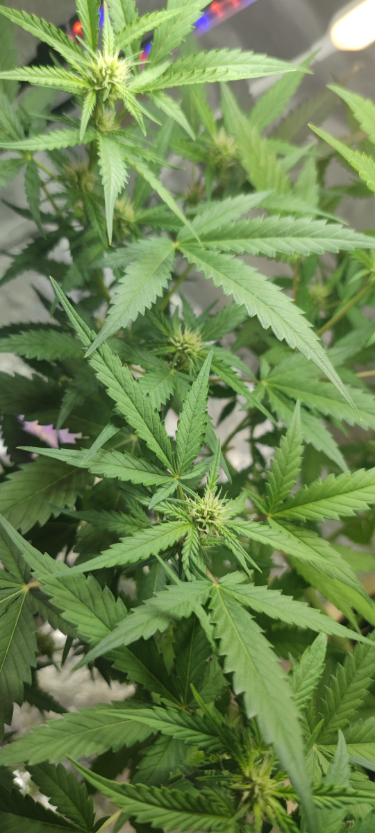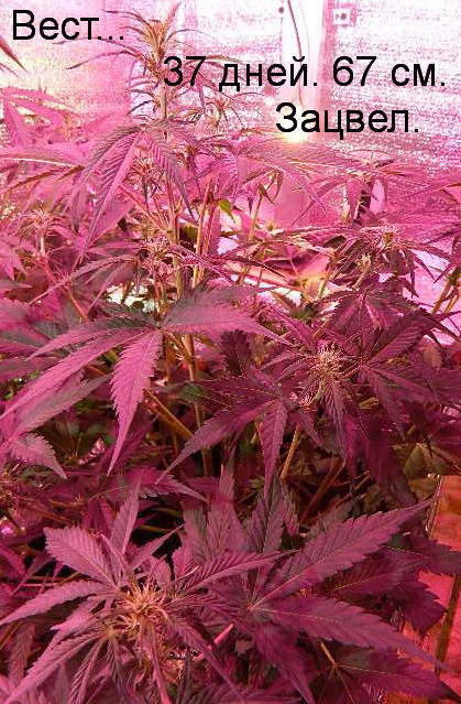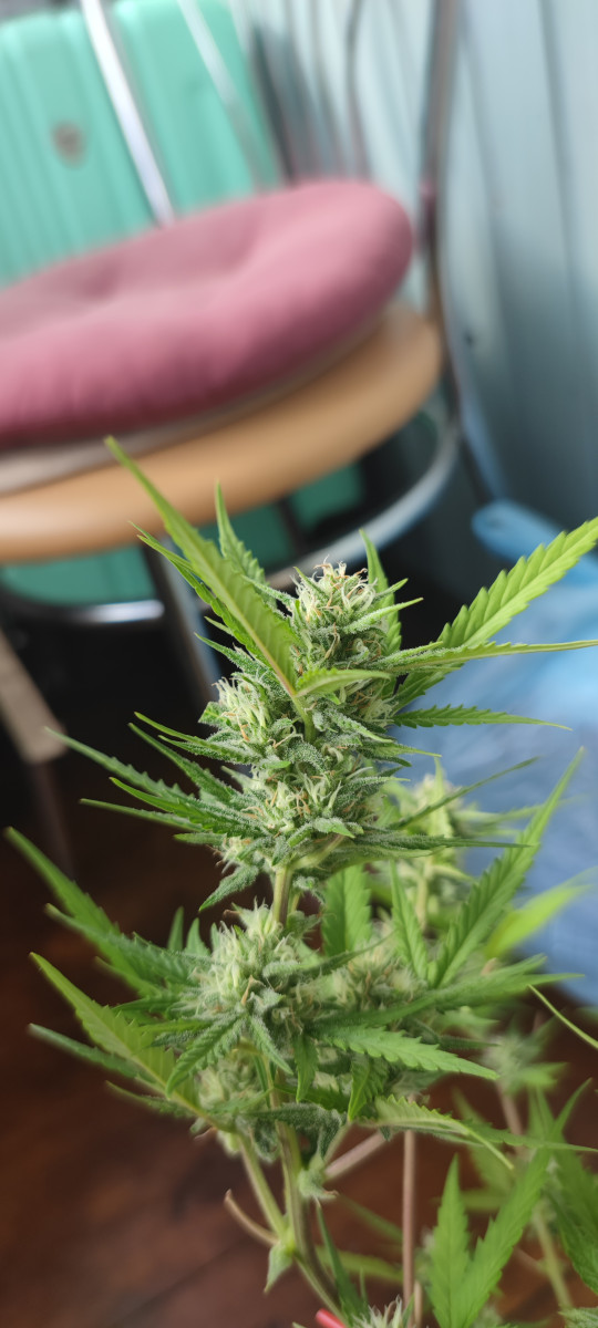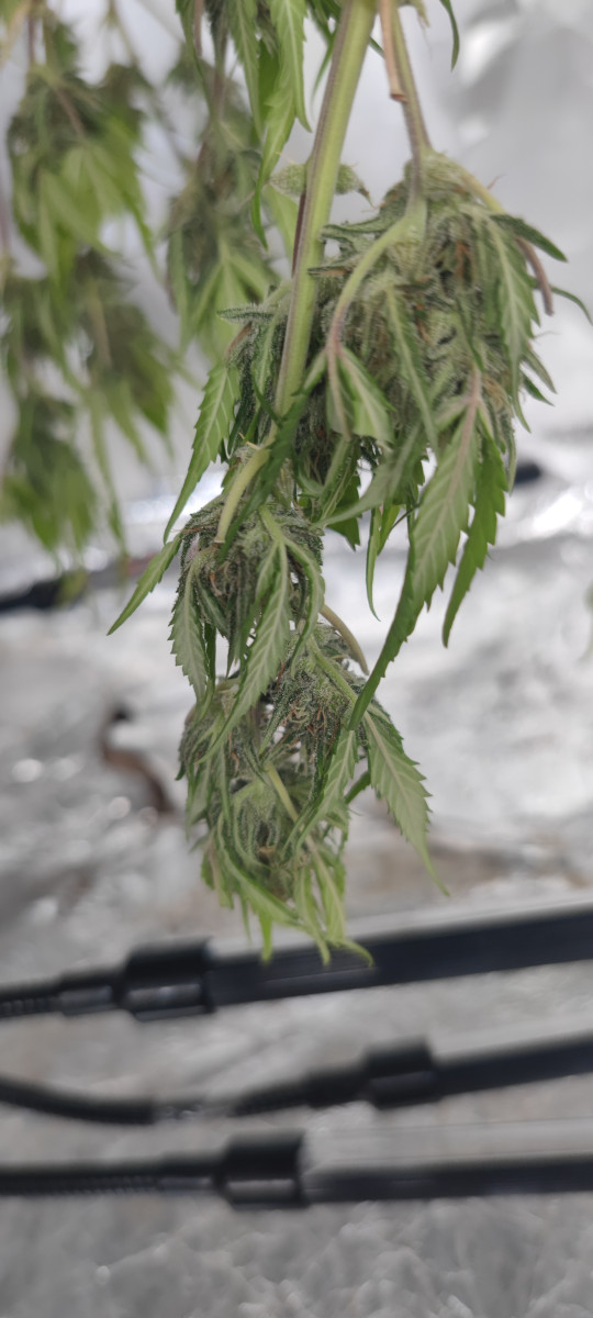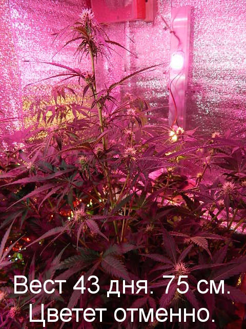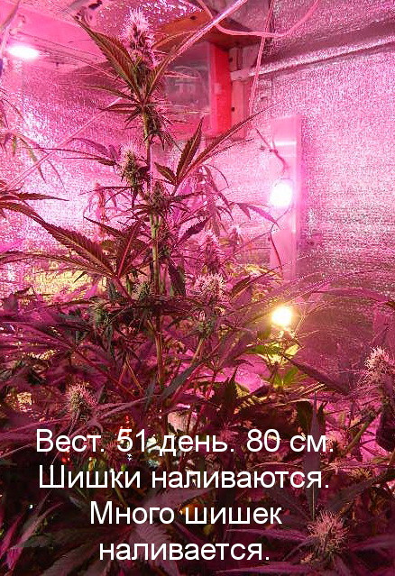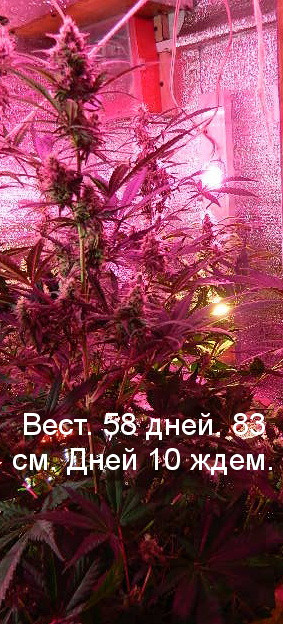 Растихе 53 дня, набухают шишки, смола хорошо выделяется. Сорт очень сильно действующий. Срезал одну макушку, высушил феном, дыхнул колпак и попутал, чуть бледного не словил. Прёт хорошо, плюс ещё она не дозрела. Ей ещё две недели точно стоять, потом в темноту на три дня закрою. Думаю, будет бомба .