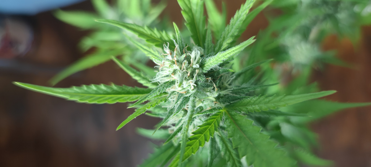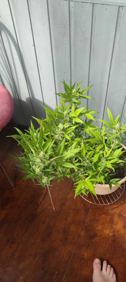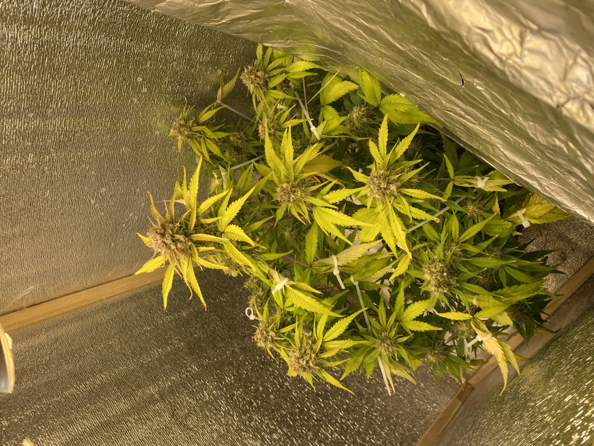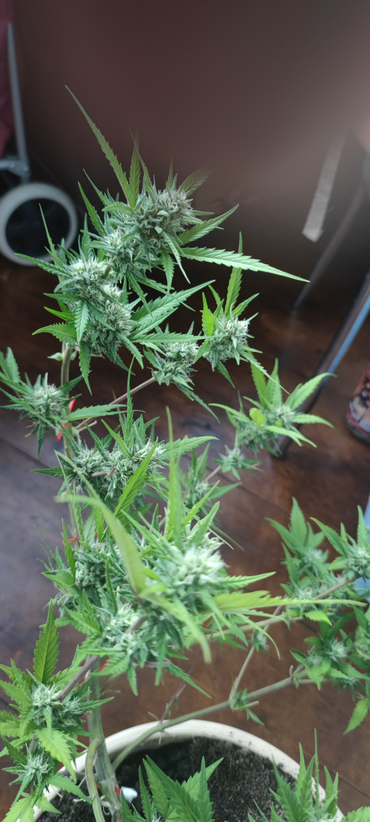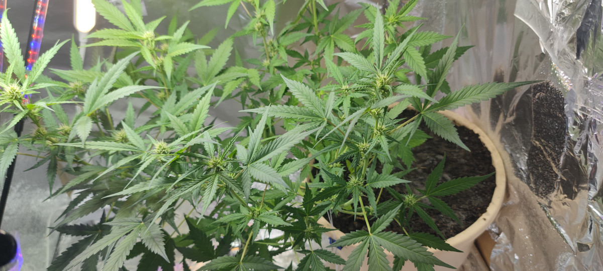 Растихе 53 дня, набухают шишки, смола хорошо выделяется. Сорт очень сильно действующий. Срезал одну макушку, высушил феном, дыхнул колпак и попутал, чуть бледного не словил. Прёт хорошо, плюс ещё она не дозрела. Ей ещё две недели точно стоять, потом в темноту на три дня закрою. Думаю, будет бомба .