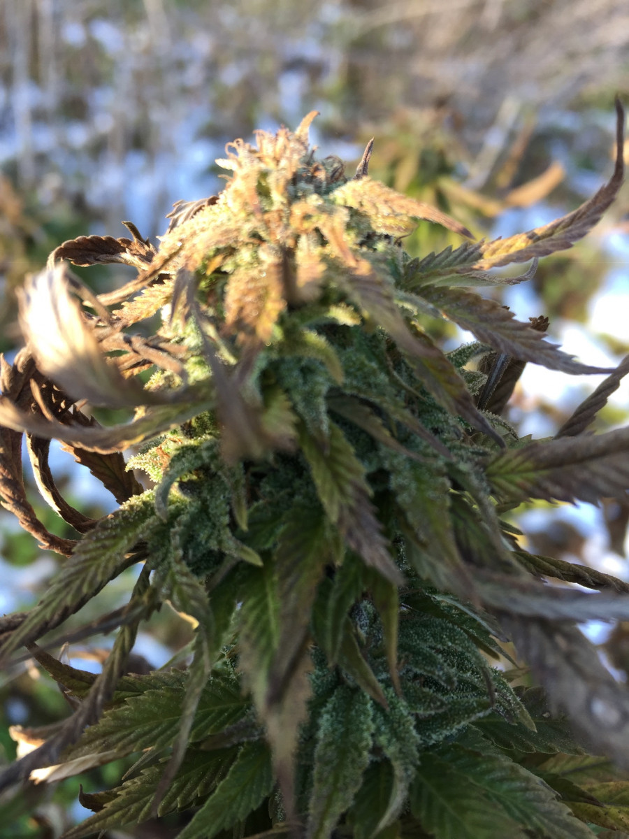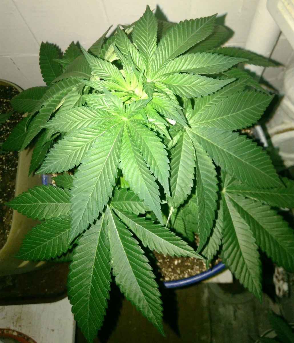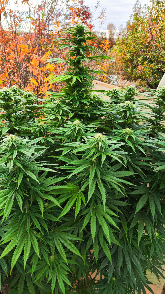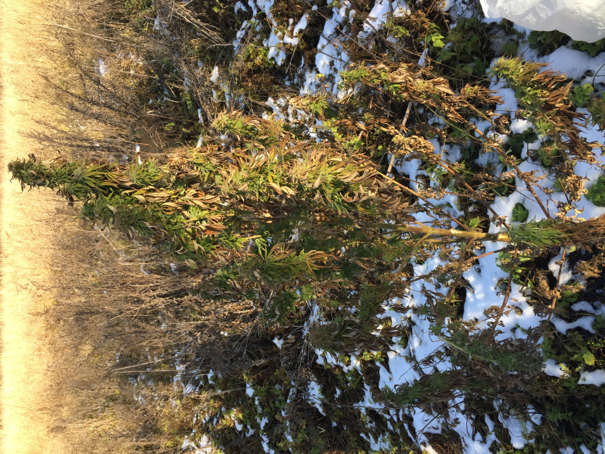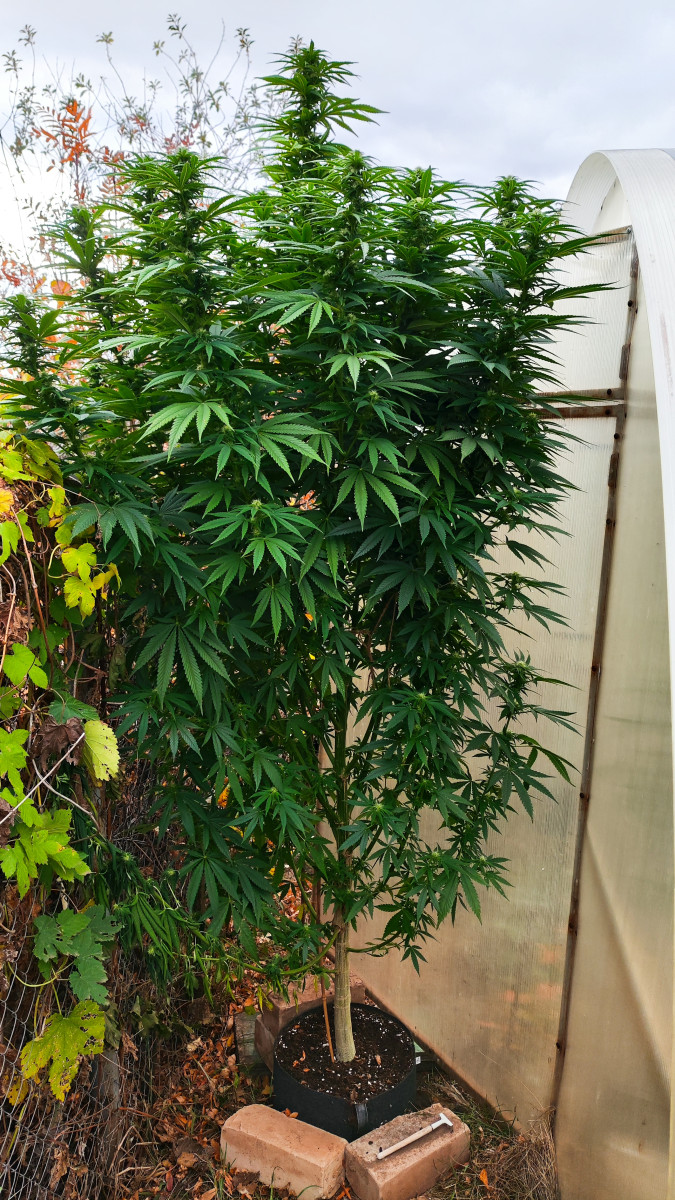 Не знал, что ствол у основания может быть толщиной с полтора литровую бутылку из под газировки!!!!!!!Сейчас 17 октября, ещё сидит в земле, местами пошла плесень, к сожалению зреть ему до кондиции ещё месяц.. но это не реально(((( от ветки до ветки ширина 4!!!! метра... Зацвёл 15 сентября... И за это время полувызревший, на глаз он даст килограмма 3 сухих шишечек!!!! Вообще не, не знаю,или с генетикой так повезло, или ещё, чего , но он просто огромныыыййй!!!!!По эффекту через месяц цветения: 7 из 10 баллов.